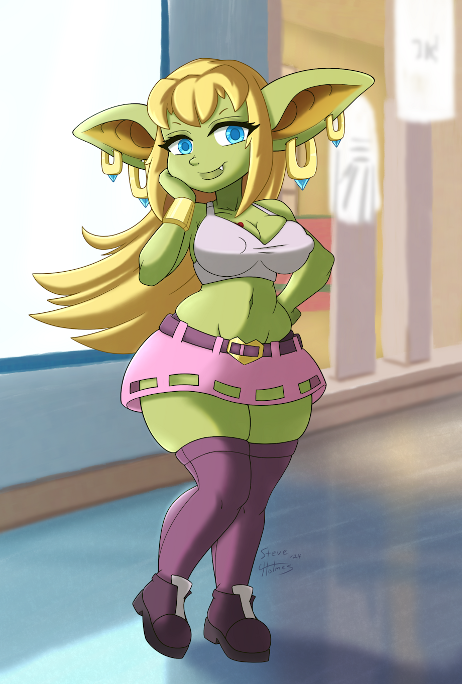 So I had an idea of just bumping into a random Goblin Babe while out at the Mall, and now here she is. I really like how the floor came out in this one since i didn't originally plan to make a background. Also giant piercings for her height <3