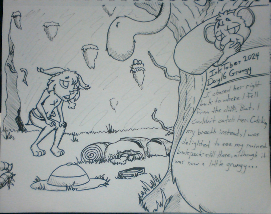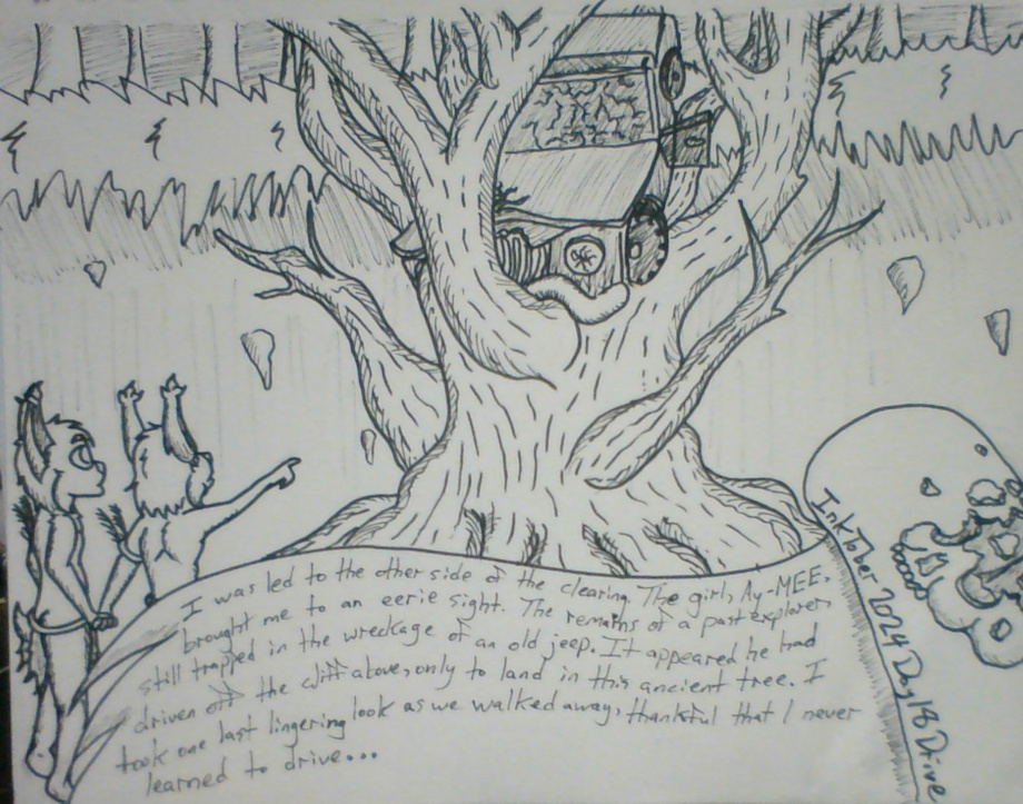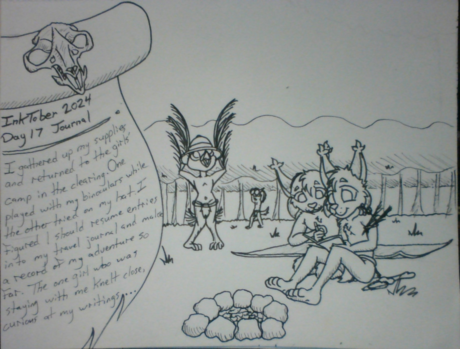 "I gathered up my supplies and returned to the girls' camp in the clearing. One played with my binoculars while the other tried on my hat. I figured I should resume entries into my travel journal and make a record of my adventure so far. The one girl who was staying with me knelt close, curious at my writings..."