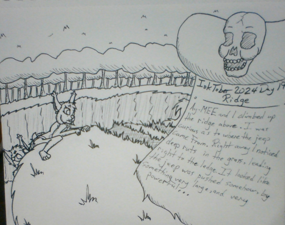 "I was led to the other side of the clearing. The girl, Ay-MEE, brought me to an eerie sight. The remains of a past explorer, still trapped in the wreckage of an old jeep. It appeared he had driven off the cliff above, only to land in this ancient tree. I took one last lingering look as we walked away, thankful that I never learned to drive..."