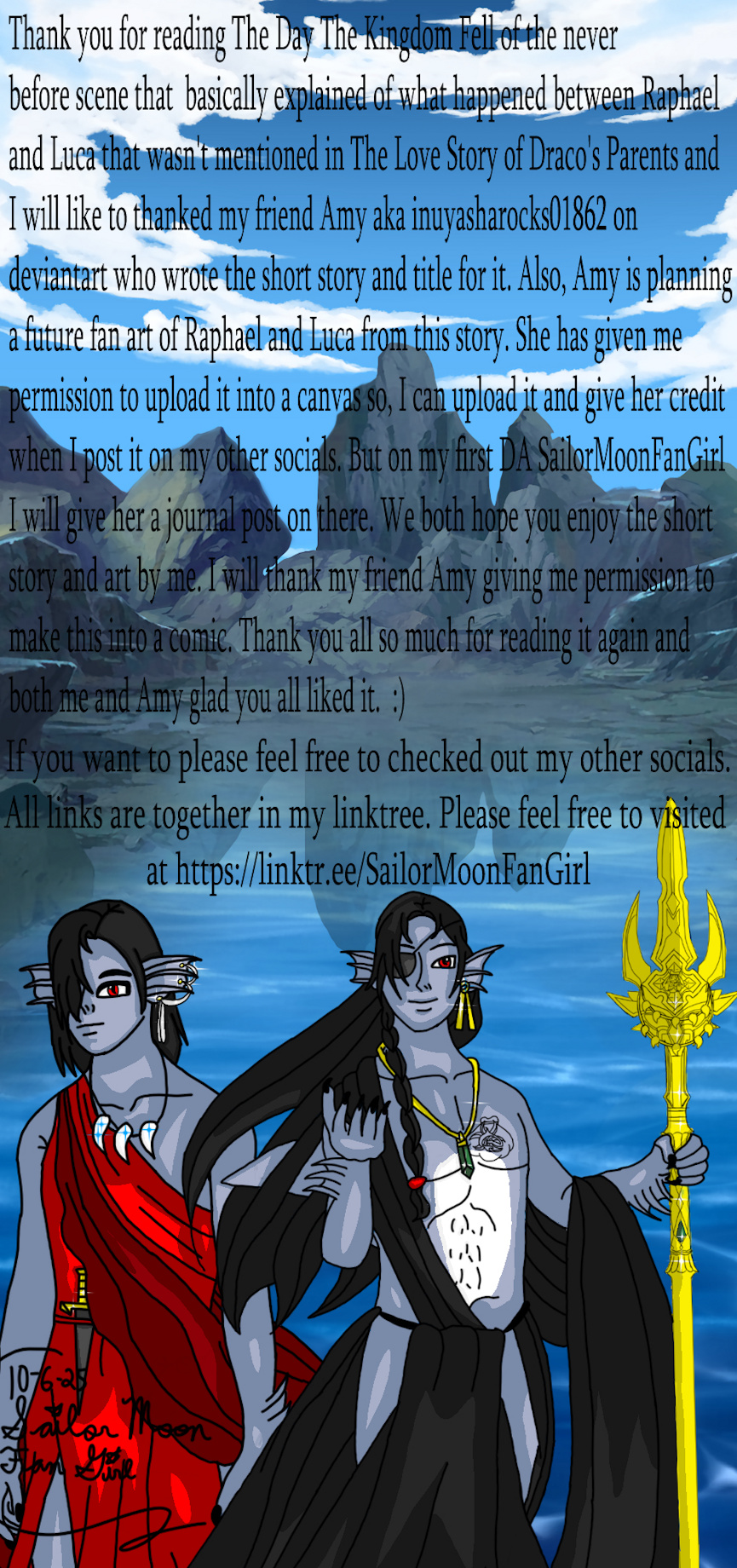 P.S. Thank you all so much for reading The Day The Kingdom Fell short story is written by my friend Amy and art is done by me. Here's a quick announcement as well my friend Amy is planning a future fan art of ocs babies Luca and Raphael from this story very soon and yes, she's giving me permission to reupload on my other socials and on deviantart on my first main one I will put the link in a journal post for her shout out on DA. Anyways I am very happy my friend Amy gave me permission to make it into a comic. Hope you are all very excited and thank you all for reading again. :)