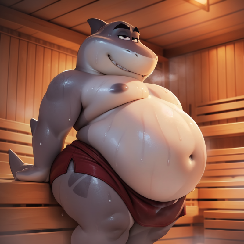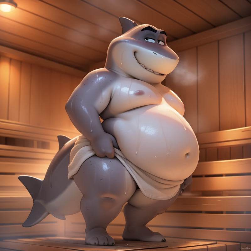 ((solo)), ((1boy)), (((males))), (((bad guys shark, mr_shark))), (the bad guys), ((smooth gray body)), overweight male, (4 fingers, 4 toes), (anthro), (((wide hips))) legs, feet, steam, (((sweat))), (((plump. chubby))), ((seductive pose)), (((sweaty, very sweaty, musky, visible musk))), ((detailed eyes, detailed face)), ((side view)), ((overweight, belly, big belly, round belly)), ((wide body)), ((wide hips, hyper_hips, fat_hips, fat_thighs)), (smile, happy, pleased, smirk), (low-angle view, view from below, below view), (huge, massive, big body, big booty, wide body, huge body, giant body), ((white towel around waist, white towel)), ((topless, shirtless)), (moobs),