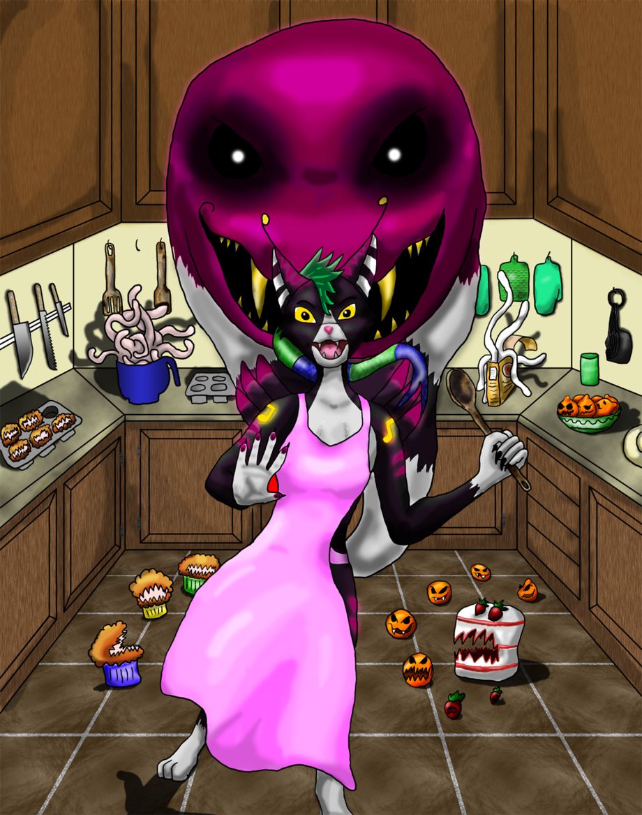 Her character Kitten D'Vodka has a demon possessing her tail. While this doesn't always prove to be a problem, sometimes I imagine that Rum's gotta bust loose and cause some mayhem! This time he's interrupting Vodka's dessert by possessing her favorite treats!