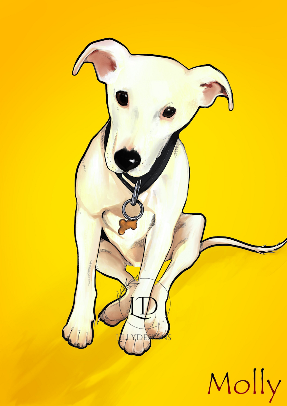 This is an illustration of Molly, a gentle and curious dog with a playful spirit. Her soft white fur and expressive dark eyes convey a sense of innocence and warmth. Molly's slightly tilted head and the relaxed pose give her an endearing, inquisitive look, as if she's waiting for a treat or some affection. The bright yellow background perfectly highlights her pure personality, making her the centre of attention, while her collar and bone-shaped tag hint at her cherished place in someone's heart.