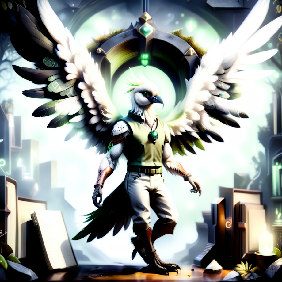 A humanoid creature with white and green feathers and a bird's head stands in a magical setting. The creature is wearing a green shirt, white pants, and brown boots.