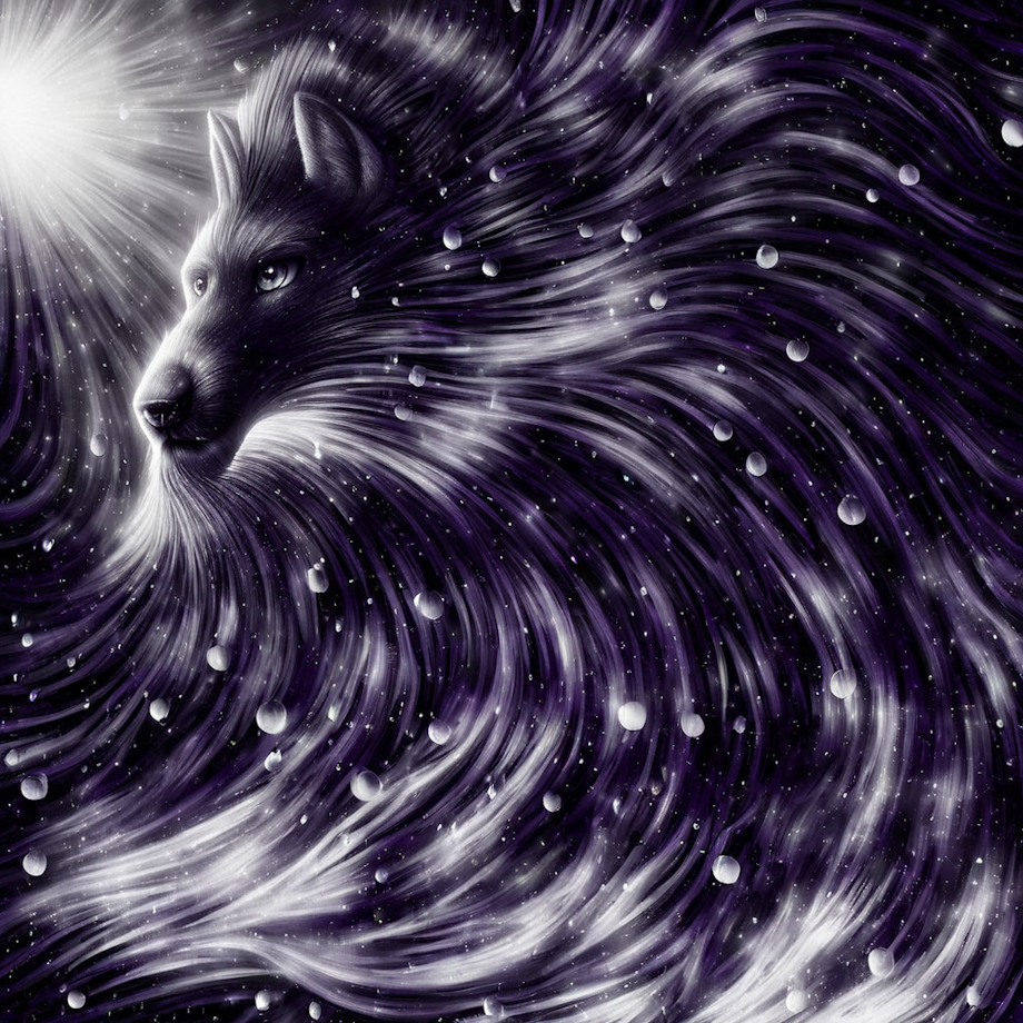 A wolf's head is shown with a flowing, ethereal mane of white light that appears to be streaming out of the wolf like a galactic swirl of light and dark.
