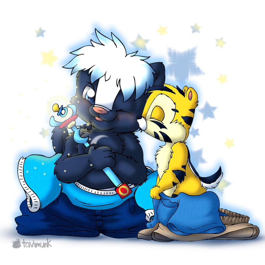 Today is my birthday! Of all the things I could ever want, spending the day (or longer) as a baby cub is my greatest wish. My sweety munk was able to fulfill this wish when he came in and gave me this cute little wand with a paci floating in it for my birthday. I was so happy that I didn't notice we were both getting smaller and smaller. Our clothes pooled around us, but we were happy and in love, so we just shared little kisses. Now we need diapees before we make a mess on the floor. X3