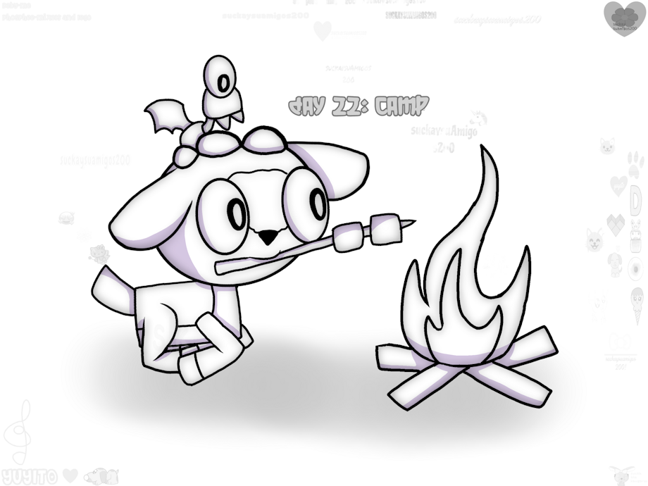 For this day I came up with the idea of drawing Deby with his little best friend Phosphee in a small camp roasting marshmallows in front of a campfire ⛺..