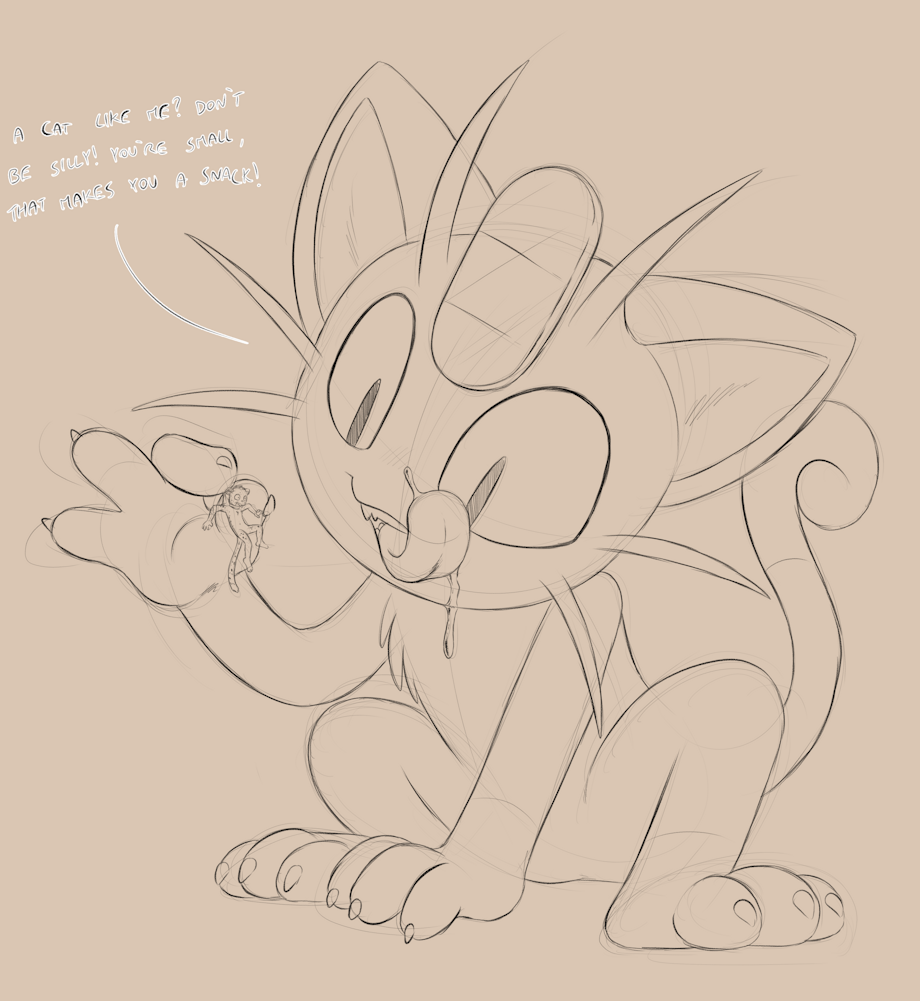 EF doodle for Catchow, at the mercy of a hungry Meowth who really doesn't seem to mind eating a smol kitty :3