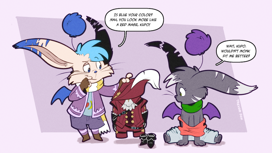 Excerpt written by Jsuelieta: "It's been years since their last adventure together. Erakir stands over a newly kupo'd, ex-dragonite, formerly Majin Mew, the moogle appreciating the fact that they're the taller one this time, unlike that time they were a Pichu. "So," Erakir starts, "Is blue your color? Nah, you look like you're more of a red mage type. That's good, versatility is always nice to have, kupo." The confused-looking Jsuelieta is handed a red outfit and wide-brim hat. "But...I'm a Majin Mew, shouldn't I be a monk or something really blasty, k-kupo...?" She says, putting the the new clothes on over her existing outfit. "Well, sure," Erakir says, grinning "You were before, but you finally got that pom-pom you wanted, so we've gotta get you something more appropriate now! Besides, that look suits you. Now come on, we've gotta find the rest of the party and get our mounts, kupo!" "
