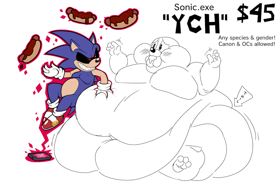 So, I'm launching my Halloween YCH a bit earlier than I planned to. You can pick either part, or pay for both! It's not an auction so don't worry about fighting for who gets to be fattened by Sonic.exe. This won't be a longtime thing though, I'll be closing up slots for these later in November most likely. So act fast.