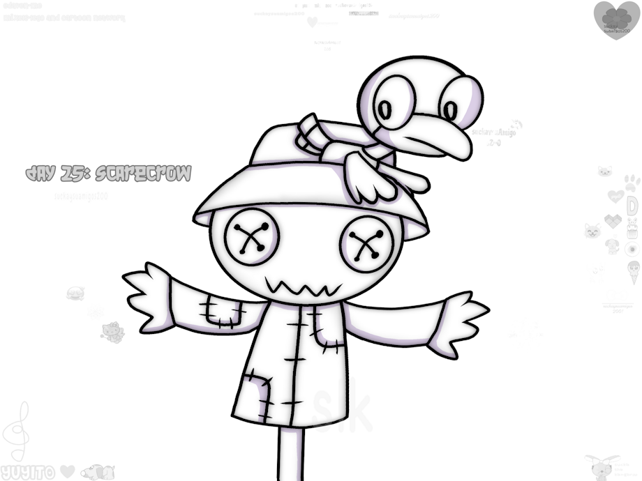 para este día se me ocurrió dibujar a Edaven quién mientras volaba por algunos jardines de maíz en mixeland se encontró un extraño espantapájaros que le llamó la atención.