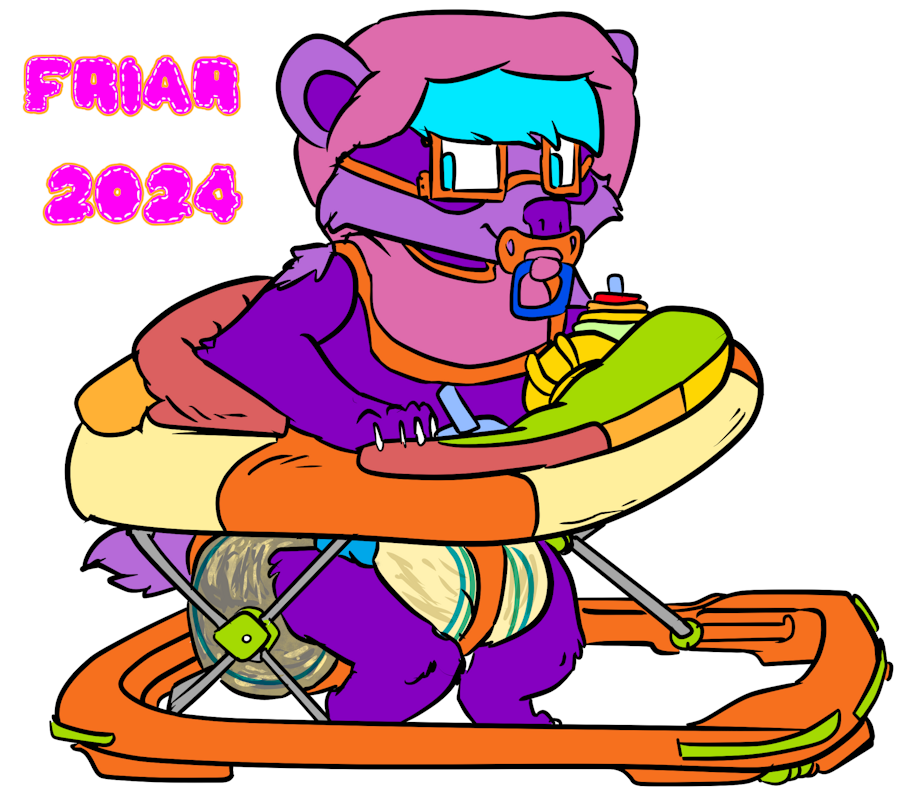 Illustration of Everett the wet and messy diapered badger wearing a bonnet and a bib, sucking on a pacifier while seated in a baby walker.