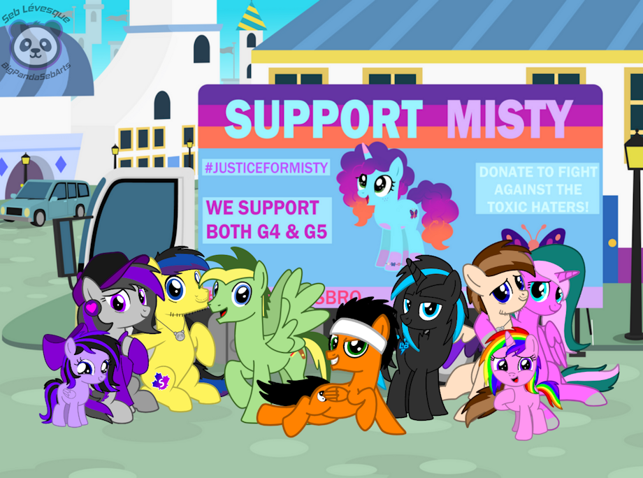 Here's a huge drawing about PonySeb 2.0's and Seb the Pony's family with its friends Didgeree, LeKonar and Lighting Bass in front of a advertising truck showing a "support Misty" advertising.
