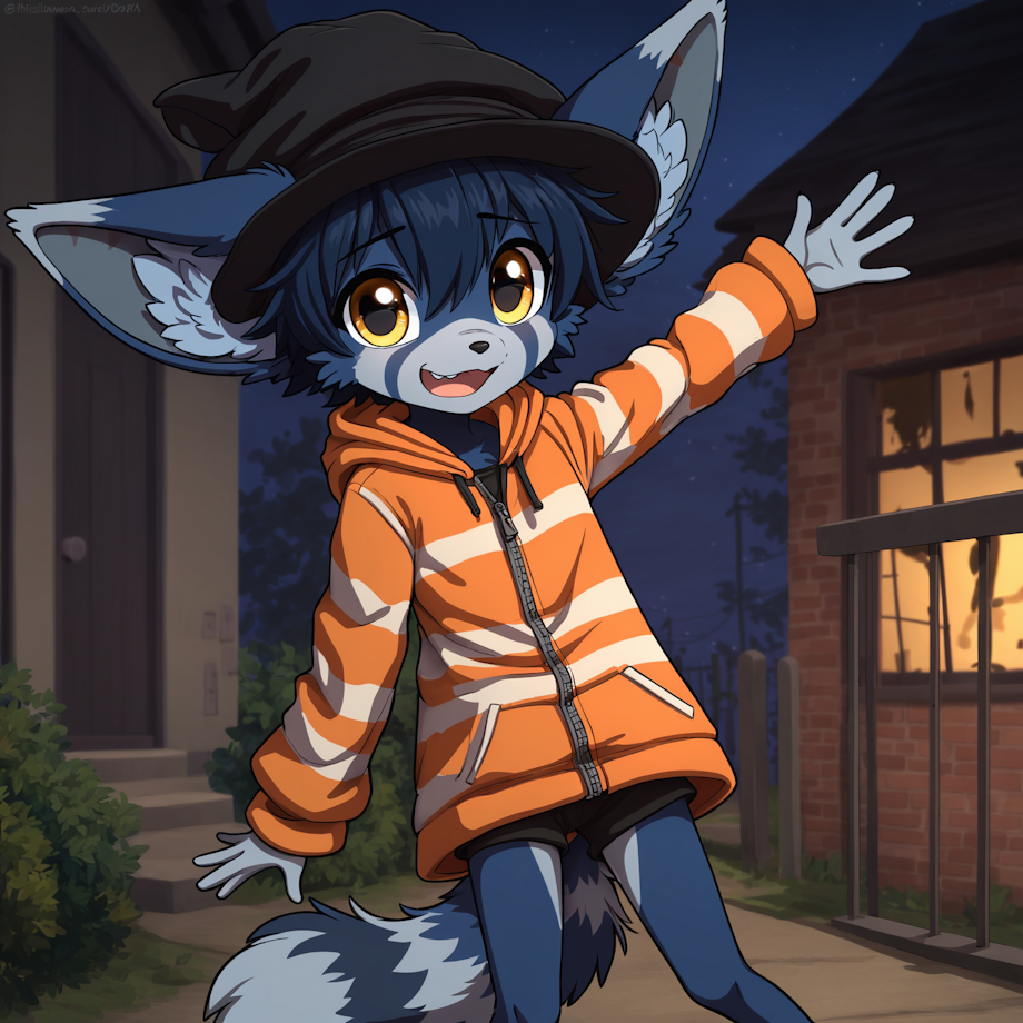 best quality, best anime, masterpiece, small little kid ((DanteAffinityXD)), little kid, little anime boy, child, anorexic, blue fur furry, anthro, thin, small child, solo, 1boy, cute, male, (fennec), ((long fluffy tail)), (fennec ears), skinny cute anime little kid, highly detailed, adorable, tween, 9 years old, young, cub, sneaking, mischievous, robber costume, criminal, wide brimmed hat, thief, black mask on eyes, black hat, thief outfit, outside at night on Halloween, tight clothing, striped outfit, oversized coat, prisoner, aloof, knowing, looking at viewer, energetic, cute pose, enthusiastic, barefoot, digitigrade, street, neighborhood, full body, 9 years old <lora:danteaffinityxd_xl_furrymodel:0.8>