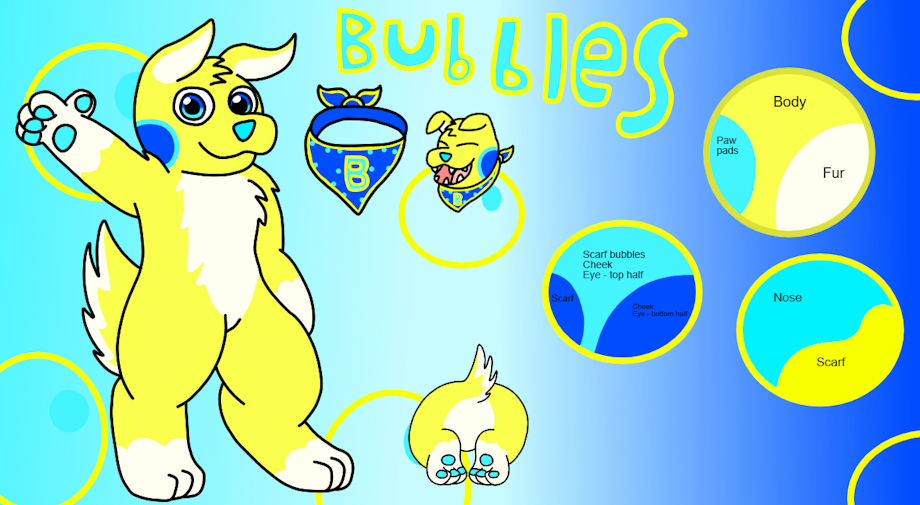 Bubbles the Dog can get pretty hyper and excited. Being a dog means he's just naturally playful and pretty fluffy, Bubbles is 21 with a slightly young sounding voice, can be a little childish, has the ability to blow bubbles (like the monster Mizutsune from Monster Hunter), and loves to hangout, play, and mess with his friends