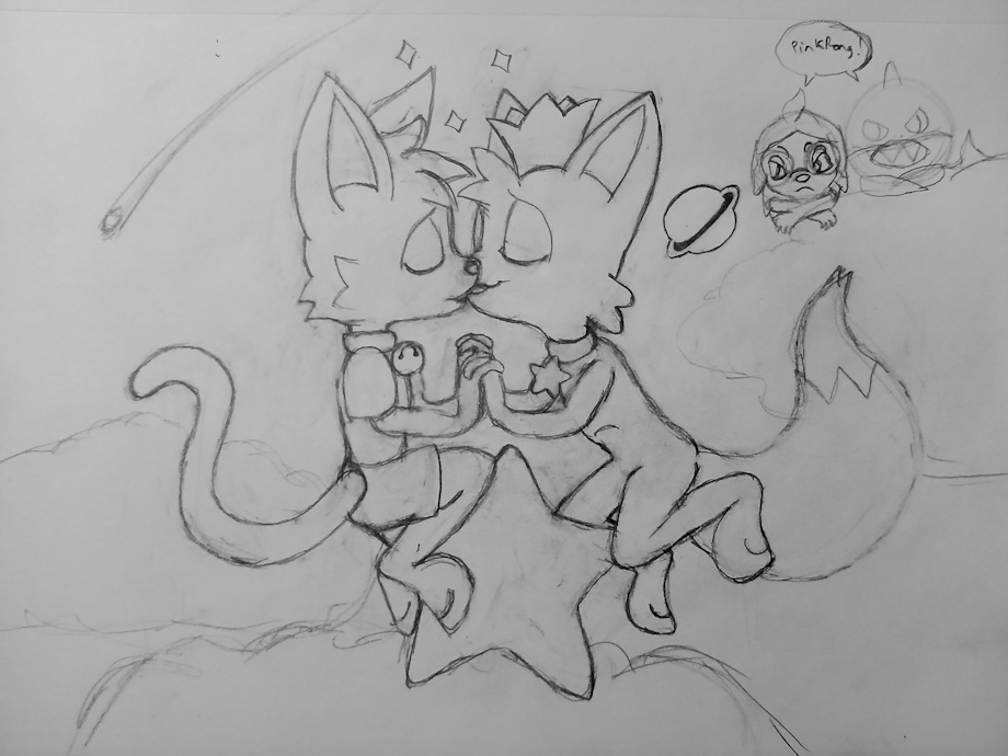 The inspiration for this piece is Pinkfong's and Hogi's so called "Friendship badge" (from Pinkfong Wonderstar Episode 1 - Welcome to Wonderville) which shows the two floating and holding hands with their faces almost touching while they drift above a large star in a cloudy nightsky. This piece is meant to poke a bit of fun at the subtext of Pinkfong x Hogi friendship badge that looks like something much deeper is going on. This could easily be a "friendship badge" for Binx and Pinkfong, but this one pushes the envelope even further with an intimate and sweet kiss. Pinkfong is a creature of innocent naivety, prone to follow his impulse in the moment and his impulse was to kiss the handsome blackcat. Lucky for him, Binx was hoping the pretty pink prince would see fit to do just that! It'd be rude to upset a prince, and so Binx responds in kind.