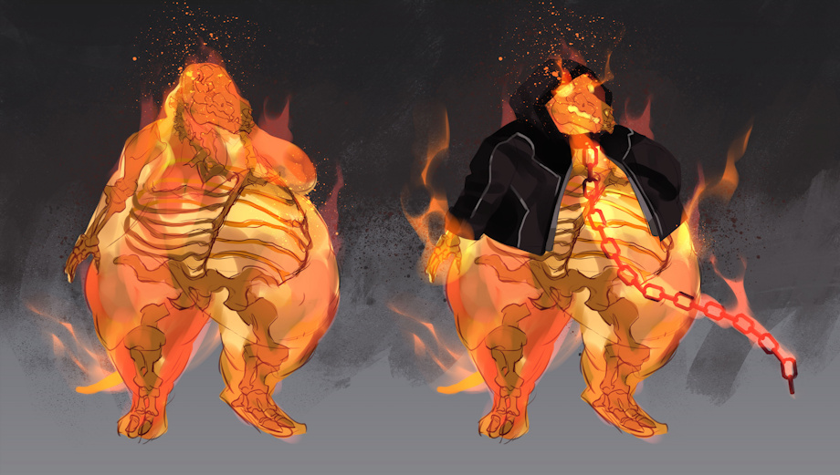 The artist imagined as a first appearance to keep her obese, to put the color of these flames of a natural color being from yellow to orange and to be inspired by the style of Ghost Rider with the hoodie and the addition of a chain around the neck.