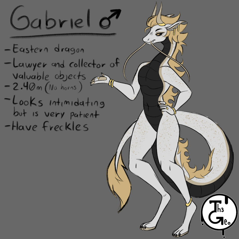 His name is Gabriel! And my first dragon as well. He's my most big OC so far [2.40m without the horns] I love his design ❤️ He's going to help me practice a different type of anatomy [more "long" anatomy (?)]