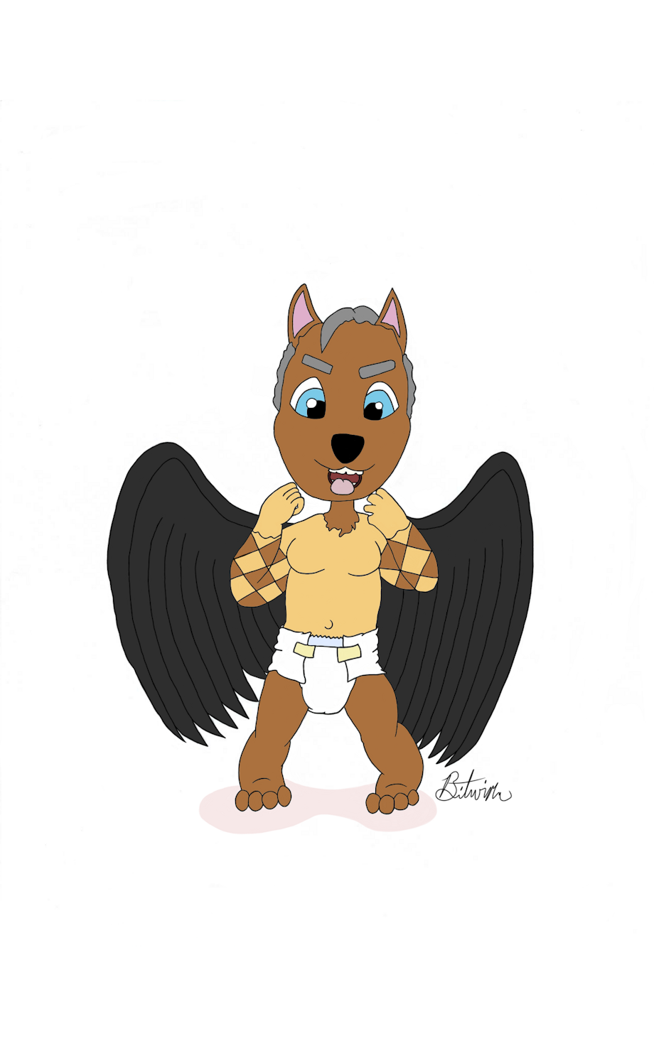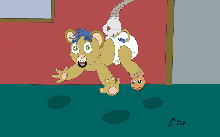 Marcus the hybrid is being very cheeky and playful, sticking out his tongue before he gets dressed for his next adventure