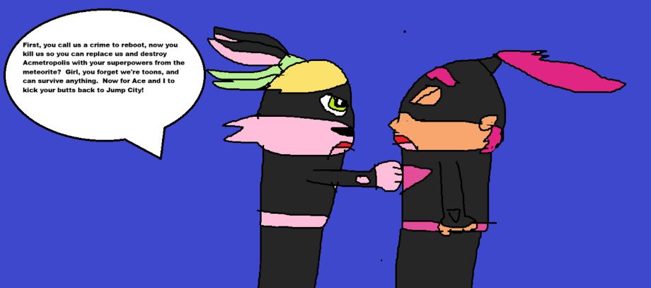 Looks like the Loonatics have returned to life thanks to cartoon logic, and not happy with Rocket Robin, Solar Flare, Hackborg, and BaBoom Boy (the Teen Toonatics forms of TTG Robin, Starfire, Cyborg, and Beast Boy) using their powers to cause destruction in Acmetropolis, have decided to teach these so-called superheroes a lesson and kick them out.