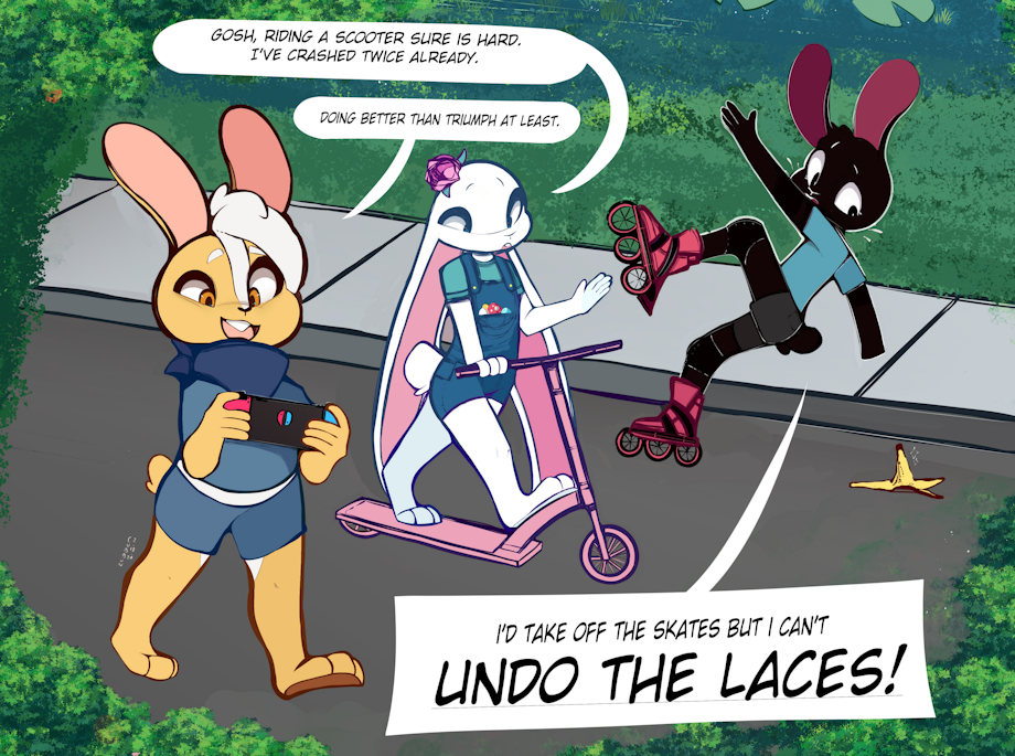 Oh no! It's Bungles once again! Hanging out with two other bunnies, nonetheless--at this point, it's gonna be a bunpocalpyse! Well, speaking of ill fortunes--Triumph might be having some troubles navigating his wheels; that's why Bungles considers it a great success at just maintaining a vertical position along with Toki.