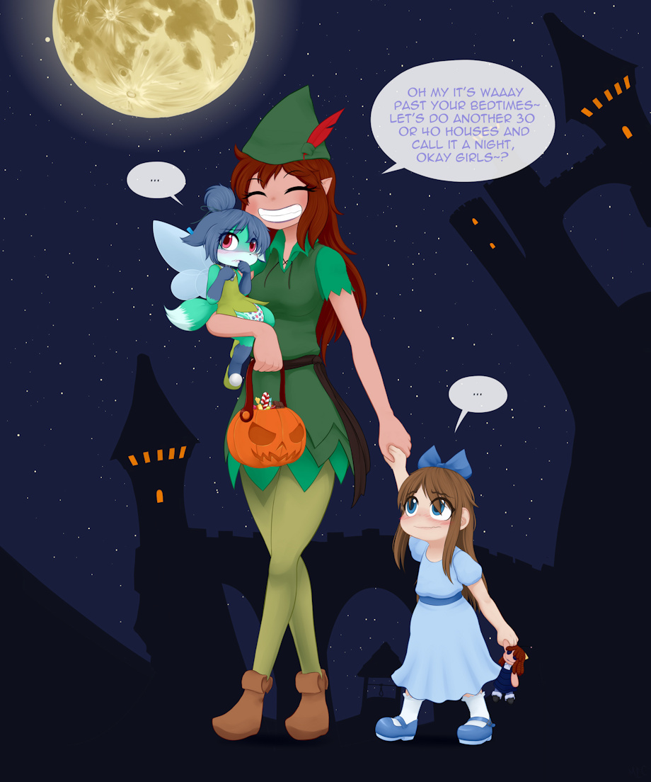 Starring, from left to right, Talcum, Anne and Annie, dressed up as characters from Peter Pan to go trick or treating. Talcum is male tho, and Annie used to be an adult male too, so this will definitely take some getting used to~.