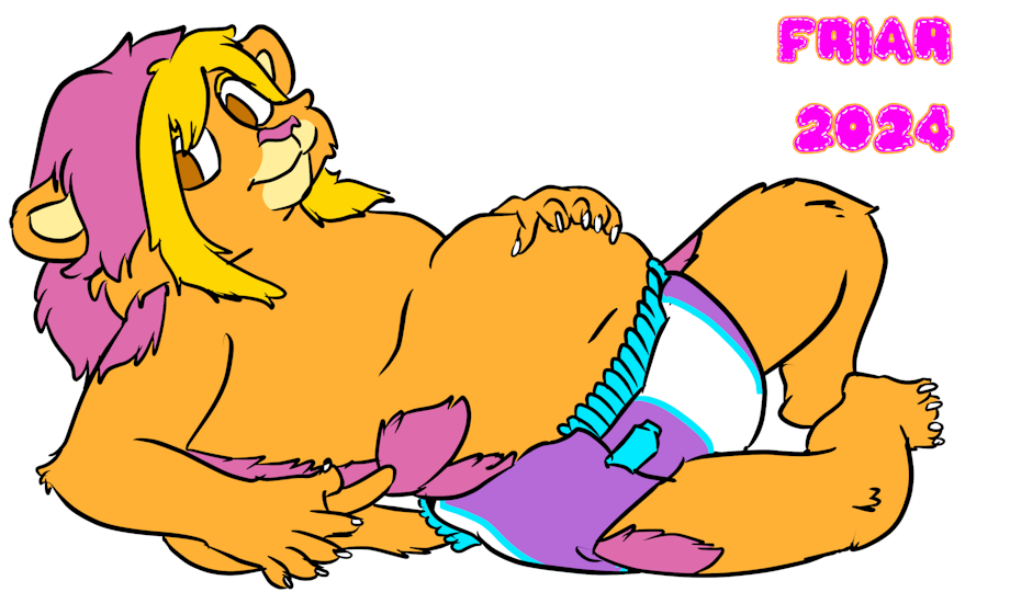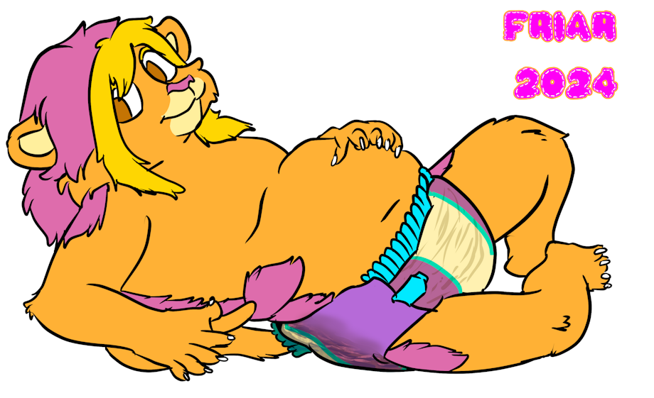Illustration of Friar the wet and messy diapered lion laying down on Berry's bed, holding his tum and tail, looking happily at the viewer.