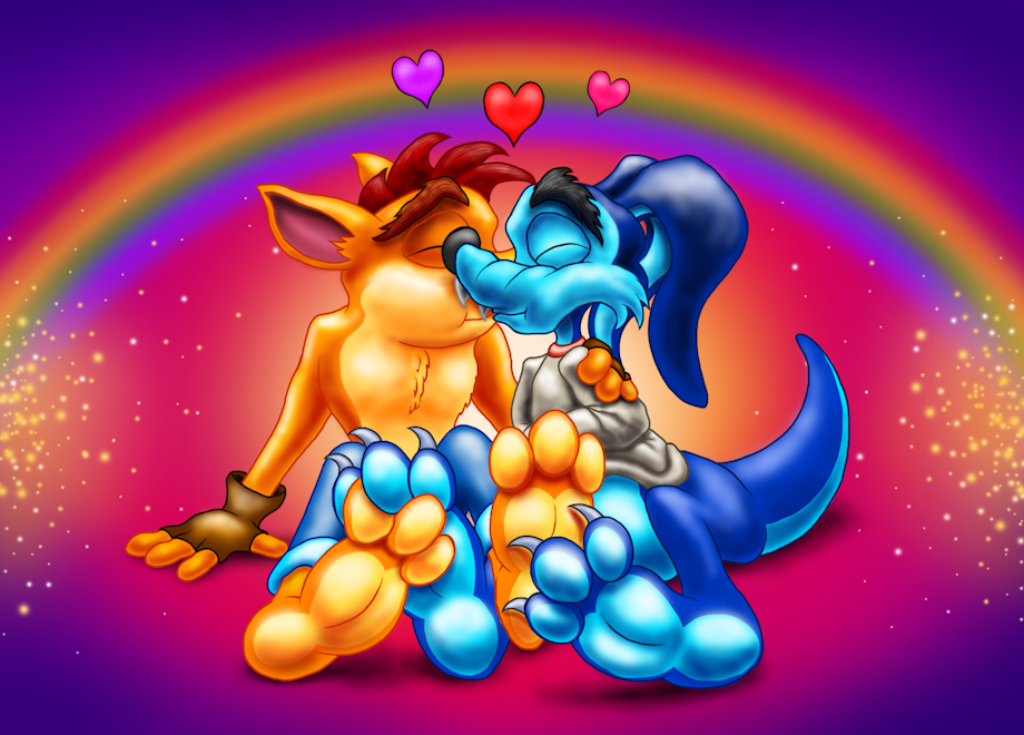 This drawing is based on a request by HarmonyBunny(requests are currently closed) who wanted me to remake his namesake drawing of Crash Bandicoot and Ripper Roo depicted as a gay couple kissing and playing footsie. Here is the link to the original. https://inkbunny.net/s/3060411 This drawing is actually of many firsts for me; it's my first drawing depicting an LGBT couple, my first drawing depicting a foot fetish(even though I personally don't have one), and my first fetish drawing that isn't toilet related. That being said, I have considered branching out and depicting other fetish artwork. I have some vague ideas and you're free to suggest some more themes to me, but just remember that I will NOT draw any nudity(particularly with genitals), outright sex, or any depictions of minors in sexual situations. At best, mildly suggestive fetish art with adult characters(particularly males) is what I'm okay with. Just take a look at my toilet drawings if you want to get some idea as far as where I draw the line.