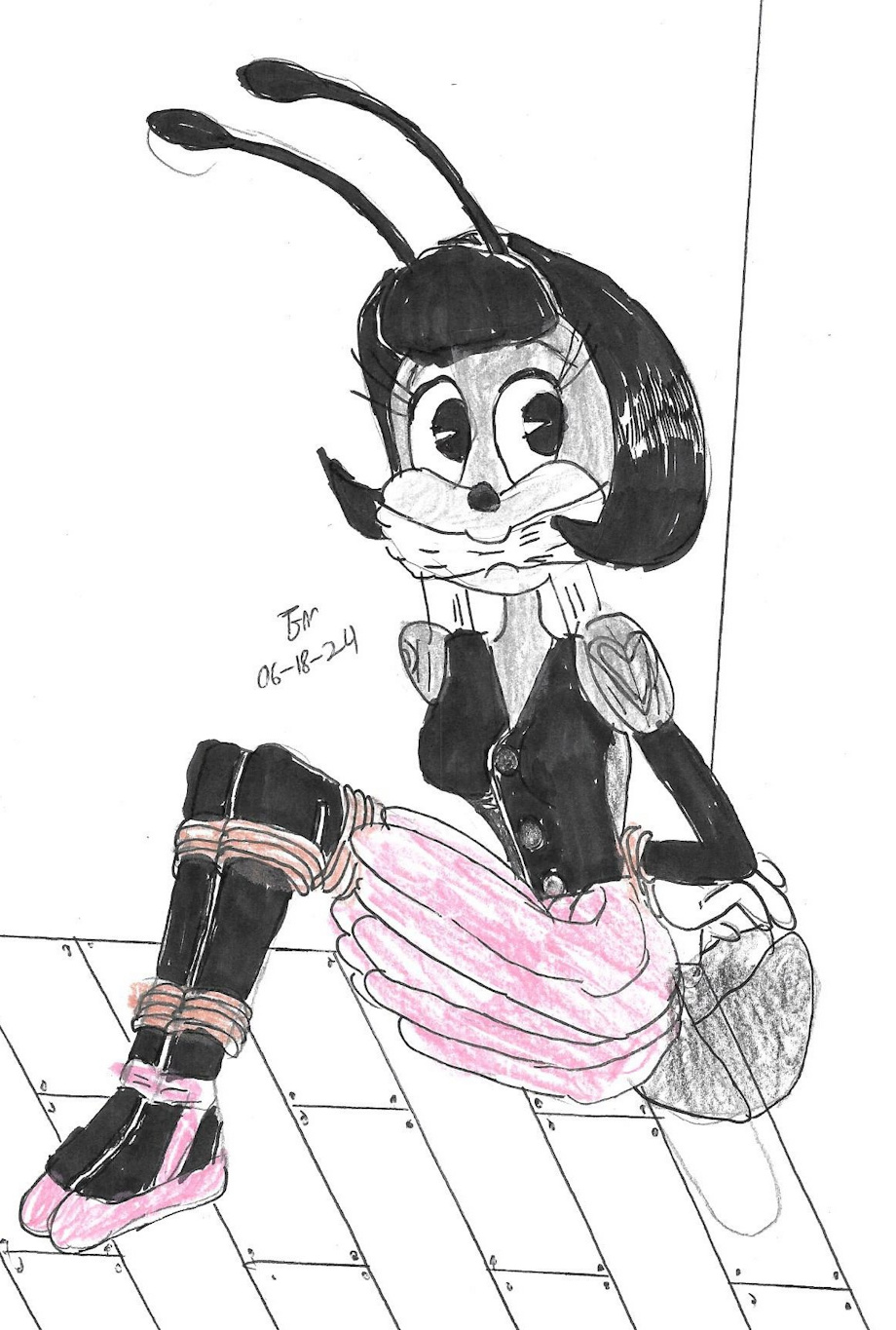 Blossom is an anthropomorphic butterfly with a distinct rubber hose cartoon style, reminiscent of 1930s-era animation. She wears a pink blouse and tutu with red and black striped dress suspenders, a black buttoned dress vest, and white gloves. She also has two light blue and black deflated butterfly wings.
