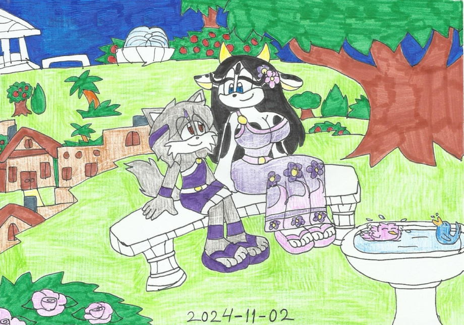 After the tour. They had a nice cosy evening, sitting on a bench, watching the birds taking a nice bath and also looking at the Ebonywood Temple. This is the time Fang was still a teenager around 15 or 16 while Juniper was still a child and it was the time before Juniper returned to her world when she was about ot turn 16.