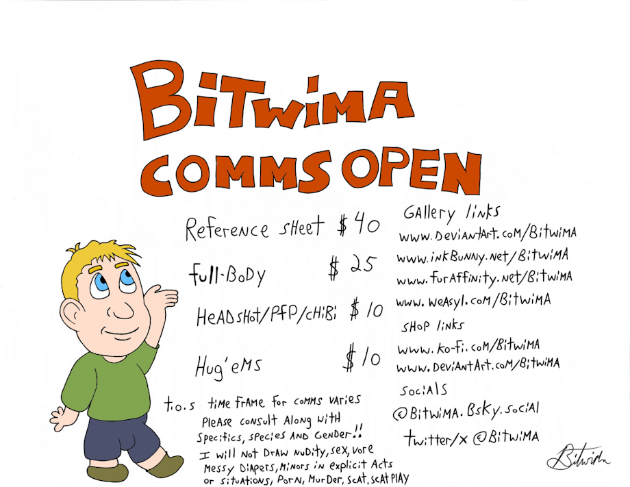 A price sheet with my current prices, t.o.s and links to my galleries and shops