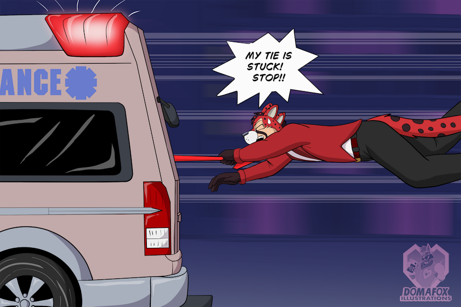 Here is a commission I did for Terastas of his Hazbean Hotel type character getting into a precarious situation with his tie stuck in the door of an Emergency.