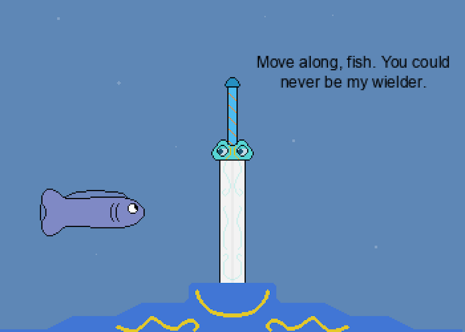 Somewhere in the ocean is an odd little shrine, holding a powerful magic sword, Hydrogladius... And it's a little tired of waiting for a wielder. It knows with absolute certainly that it'll recognize its wielder the moment it sees them, though it has no idea who it could be. Someday they'll arrive, but until then, the sword has a rather boring existence, its only real entertainment being passing fish and the rare diver it has a telepathic conversation with. It's eager to see what it's like above the surface, having been forged and enchanted underwater before being stuck into the pedestal it's in.
