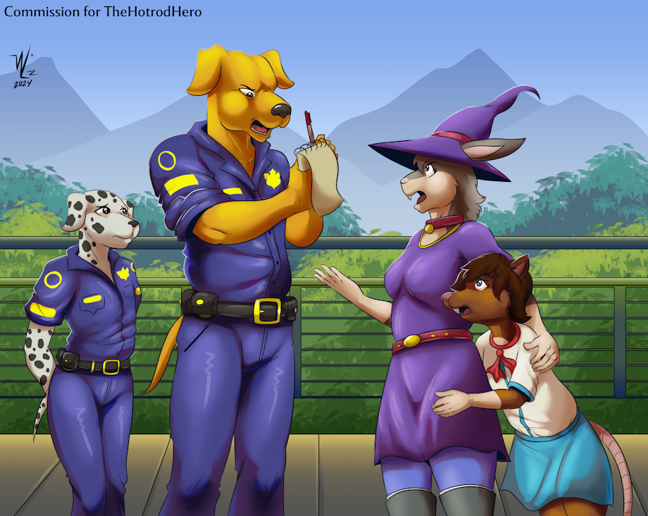 Its of my witch characters Hazel (hare) and Sylvie (rat) having a literal run in with the law after practicing witch craft in public. Firewall Cities finest officers Mike (pitbull) and Liam (dalmatian) are on the scene questioning them. Having travelled to Firewall city for a vacation, Hazel is not too happy about this.