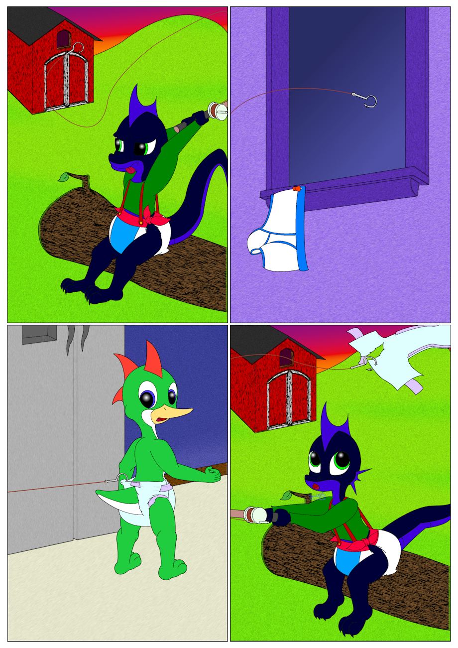 While Yosh’s father was struggling to change the impatient Parker into one of the said cloth diapers (he’s not good with knots), and Yosh woke from a nap and was searching for his boots, Leon was outside and found a fishing rod. The young hatching took a seat on a nearby log and swung the rod backward for momentum. Unknown to him, the fishhook was sent flying through the window of the house and latched onto the rear waistline of Yosh’s diaper. Before the young dino-duck hybrid could react, Leon flung the rod forward and with the sound of tearing fabric, he was bamboozled when he saw the hook fly overhead with a diaper attached to it. Hopefully there’s no one in the kitchen with Yosh…