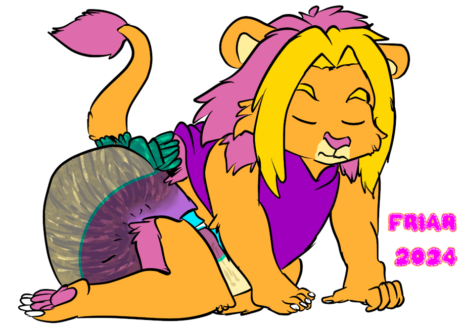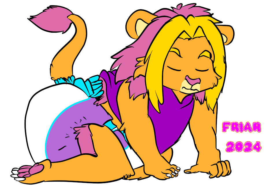 Illustration of Friar the wet and messy diapered lion crawling into a pillow fort, gripping the blanket with one paw.