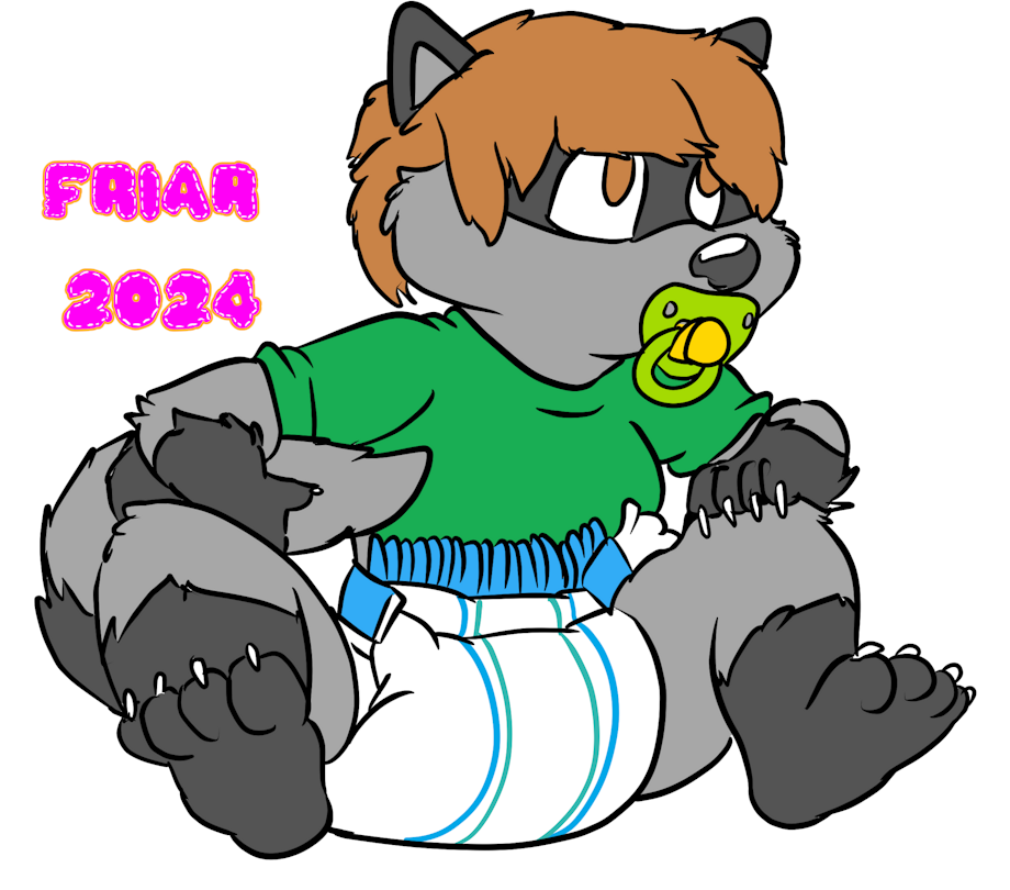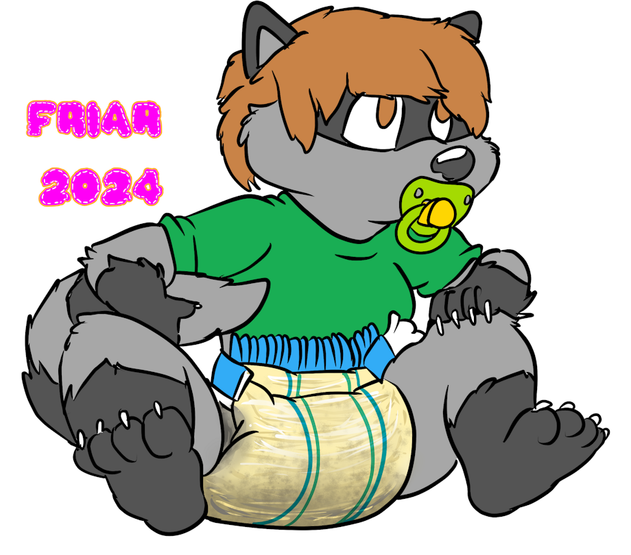 Illustration of Tylahn the wet and messy diapered raccoon holding his tail and knee while seated in a padded playpen.