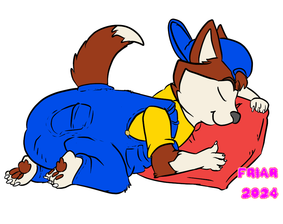 Illustrated commission of Henry the Husky messing his shortalls or filling his diaper in his sleep while hugging a pillow.