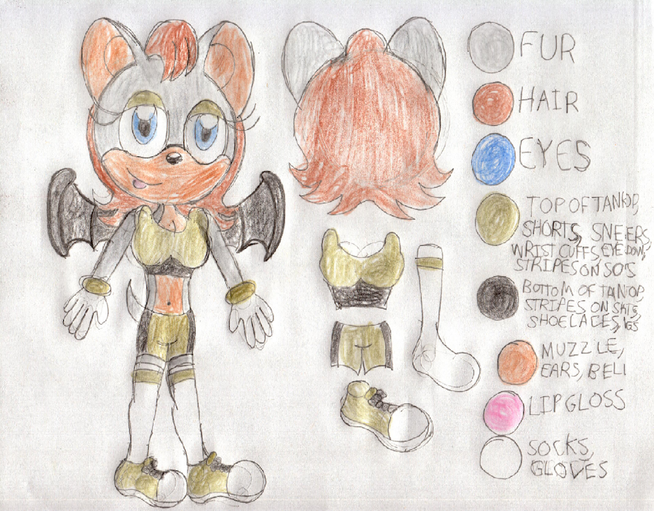 Decided to whip up an updated ref sheet for Melissa the Bat. As you can see, I changed her outfit to a gold and black tank top, gold shorts with black stripes, and gold and white sneakers with black shoelaces.