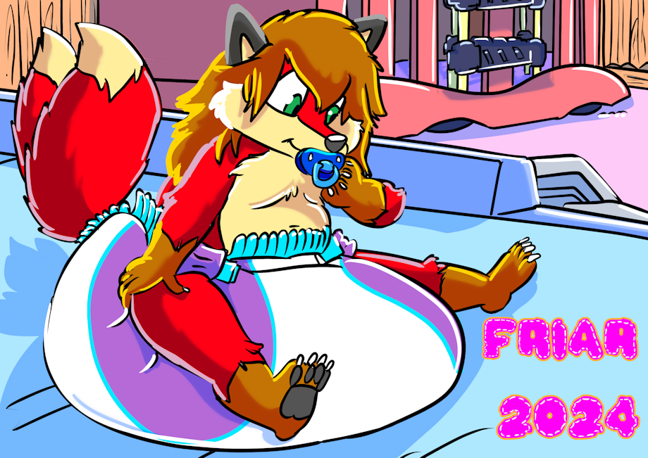 Illustration of Ozzy the wet and messy diapered two tailed fox sucking on a pacifier in a large diaper on the changing table in Friar's room with the crib in the background.