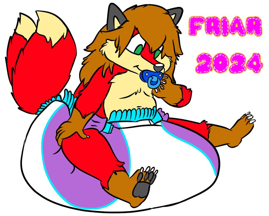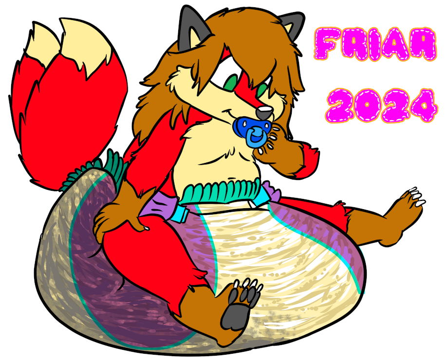 Illustration of Ozzy the wet and messy diapered two tailed fox sucking on a pacifier in a large diaper on the changing table in Friar's room with the crib in the background.