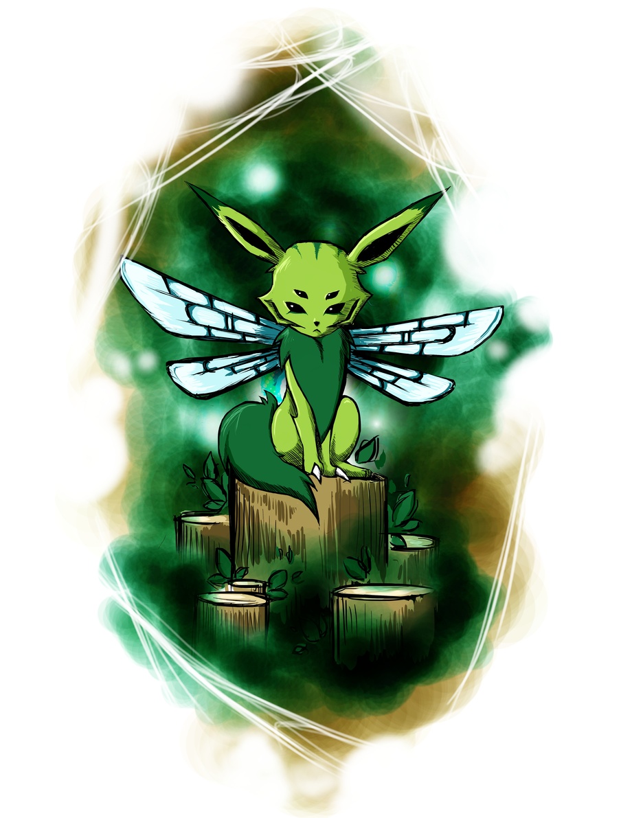Secteon is the bug-type evolution of eevee, evolves when eevee is leveled up on high friendship in the habitat of bug-types. Secteon is loosely based off of a winged spider, it's name based more off it's diet. It's wings are silent when flying, but will rub them together to create a screech of it needs to make an escape. It's main defenses are its two sharp claws, and it's incredibly soft dark green fur that irritates the skin of any person or pokemon that touches it while the secteon is scared or aggressive. Trainers can safely touch their secteon while it is relaxed, but secteon will rarely trust anyone else enough to allow it.