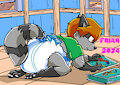 Illustration of Tylahn the wet and messy diapered raccoon finishing a rainbow spectrum puzzle on the treehouse floor.