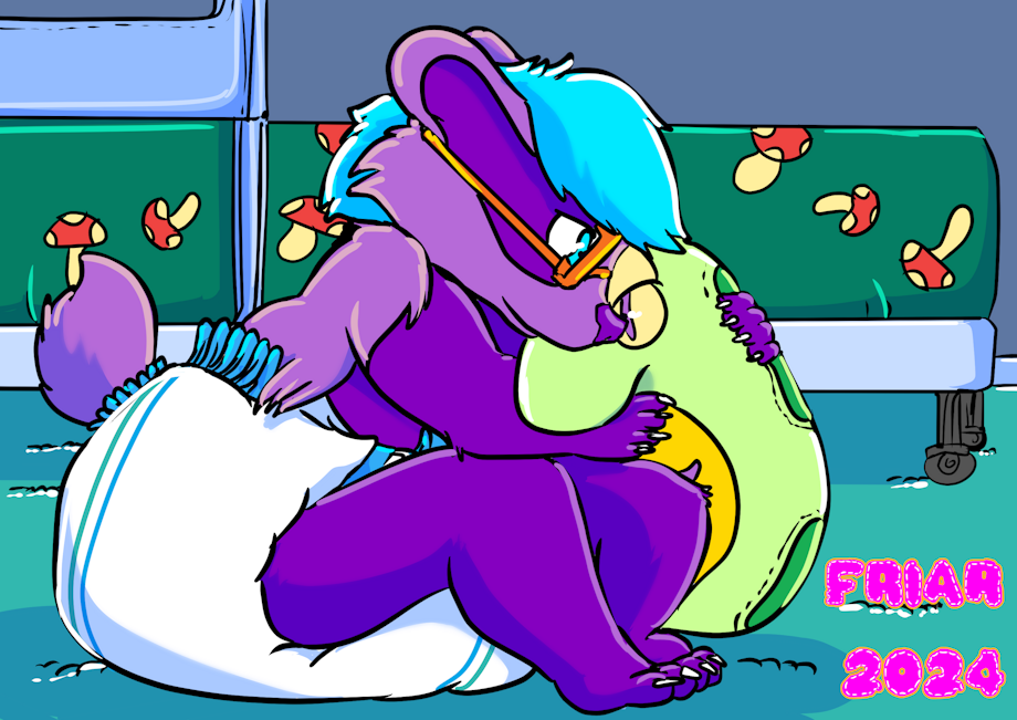 Illustration of Everett the wet and messy diapered badger snuggling his snake plushie on the floor next to his bed looking slightly sad.