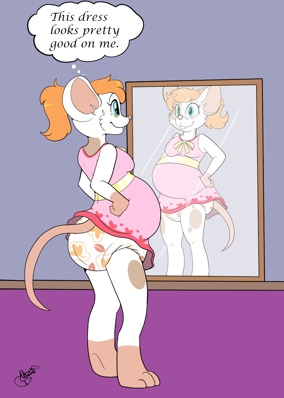 Here, Maple is trying out a few dresses (all of which Nazz himself had his own fursona wearing in the before times) and checking herself in the mirror wearing each one to see how good she looks in them.