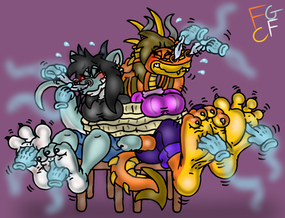 featuring both his Derg gal Kailie and my colossal long footed dragoness Jewel both tied up together having thier dergy nostrils teased n stompers tickled by ghostly hands heh^^.