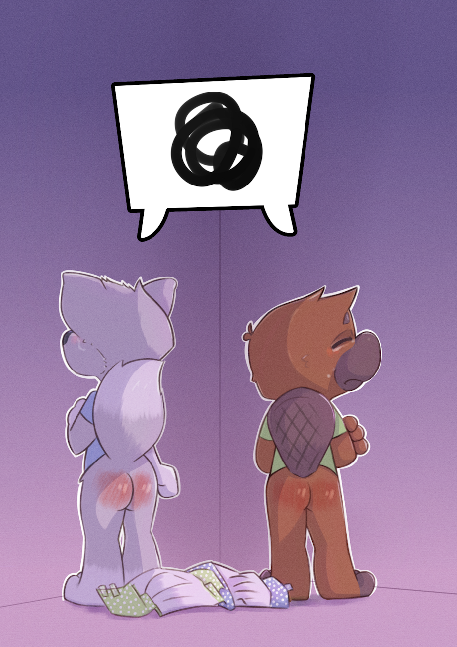 Caiden and Benny are tattling on each other for allegedly using a no-no word. Since neither tot would fess up who actually said the dreaded word, both were given a few firm slaps on their bare tushies and sent to the corner.