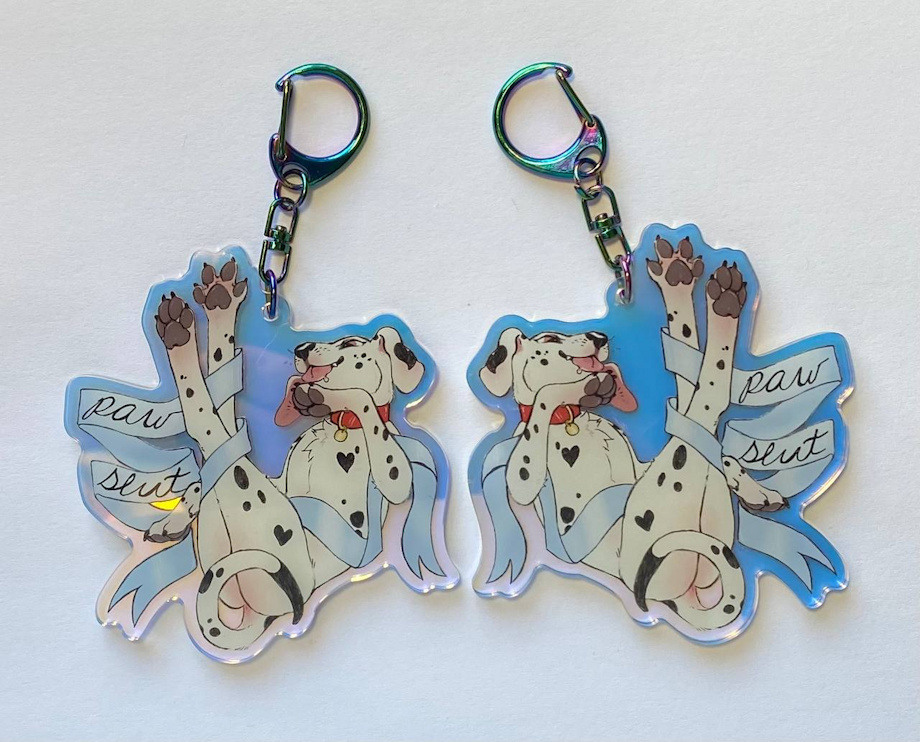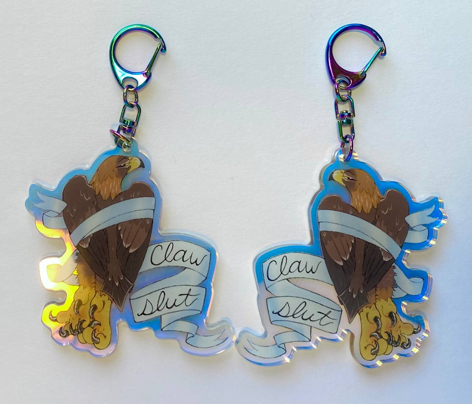 NEW versions of my "Hoof Slut", "Paw Slut" and "Claw Slut" keychains have arrived! These keychains are on rainbow holographic acrylic with a matching iridescent clasp ✨ leafhoof.bigcartel.com