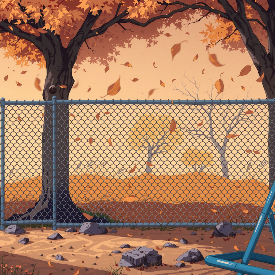 (best quality:1.4), high quality, masterpiece, a cold late autumn in december, chain-link fence, late afternoon, cold, barren, dirt, rocks, trees, leaves, school, dead grass