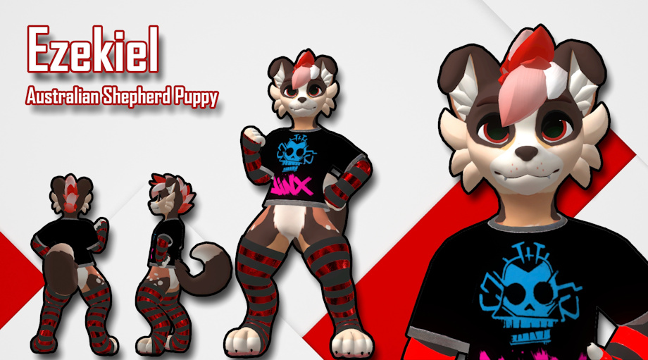 A young aussie pup, Ezekiel is defined by his natural body colors, paired with red eyes, and a white tuft of hair highlighted by bright red accents.